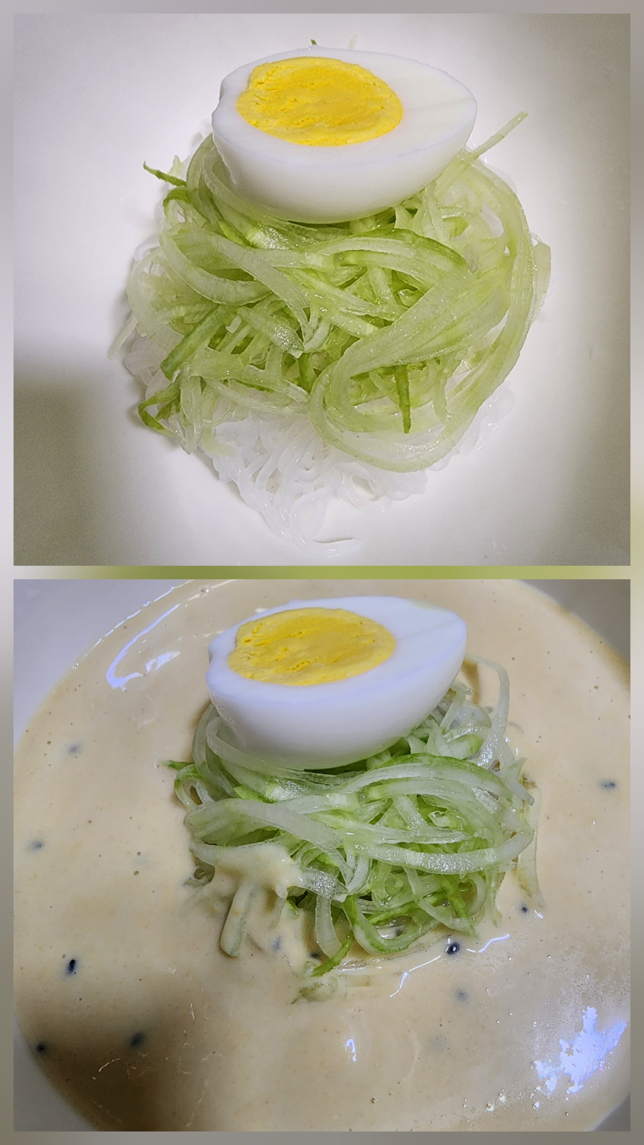 - 오이채, 삶은 계란을 고명으로 올린 후 콩국물을 부어주면 완성!