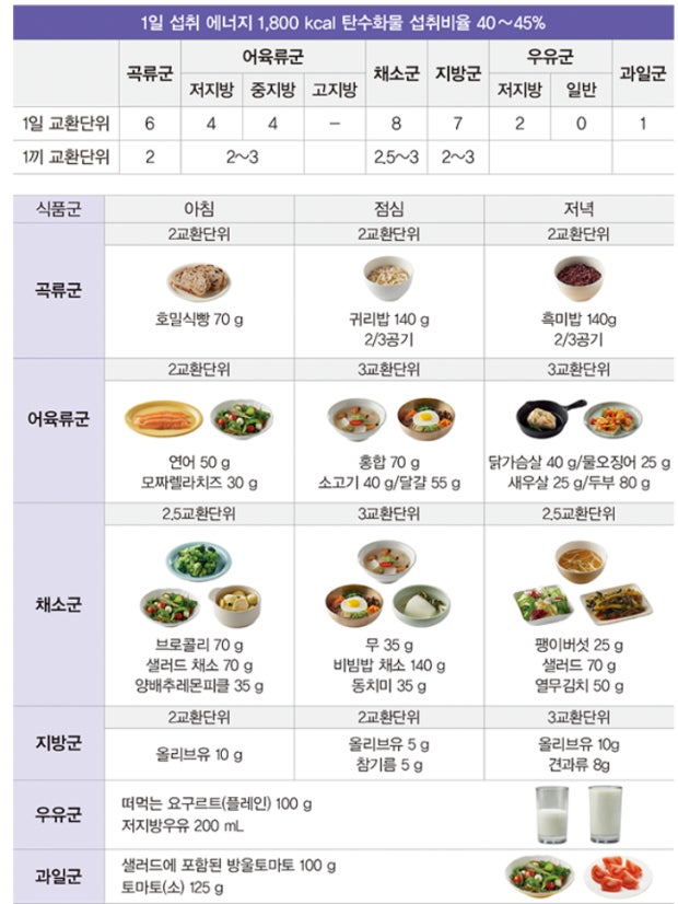 | 목 | 잡곡밥 + 배추된장국 + 계란말이 + 도라지나물 | 잡곡밥 + 김치찌개(저염) + 삼치구이 + 애호박볶음 | 잡곡밥 + 미역국 + 소고기불고기(저당양념) + 시금치나물 |