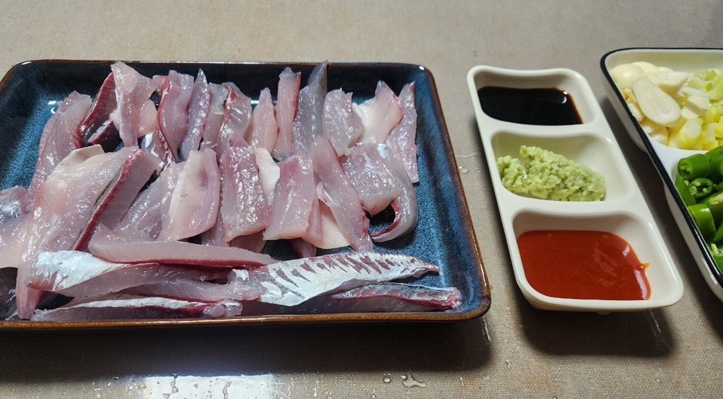 전갱이 회의경우 채썬생강와 쫑쫑썰은 쪽파를 함께 먹으면 궁합이 참 좋습니다.