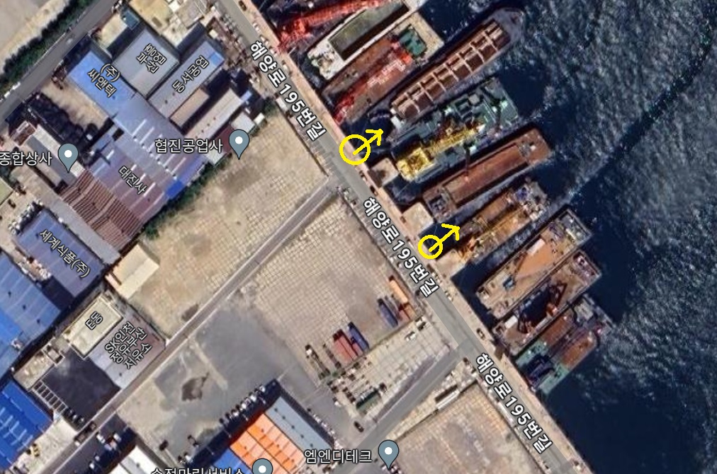 미창석유포인트도 한국타이어 포인트와 마찬가지로 덤프트럭 같은 큰 차들이 줄지어 주차를 하고 있으며 바지선들이 정박을 하고 있는 포인트입니다.